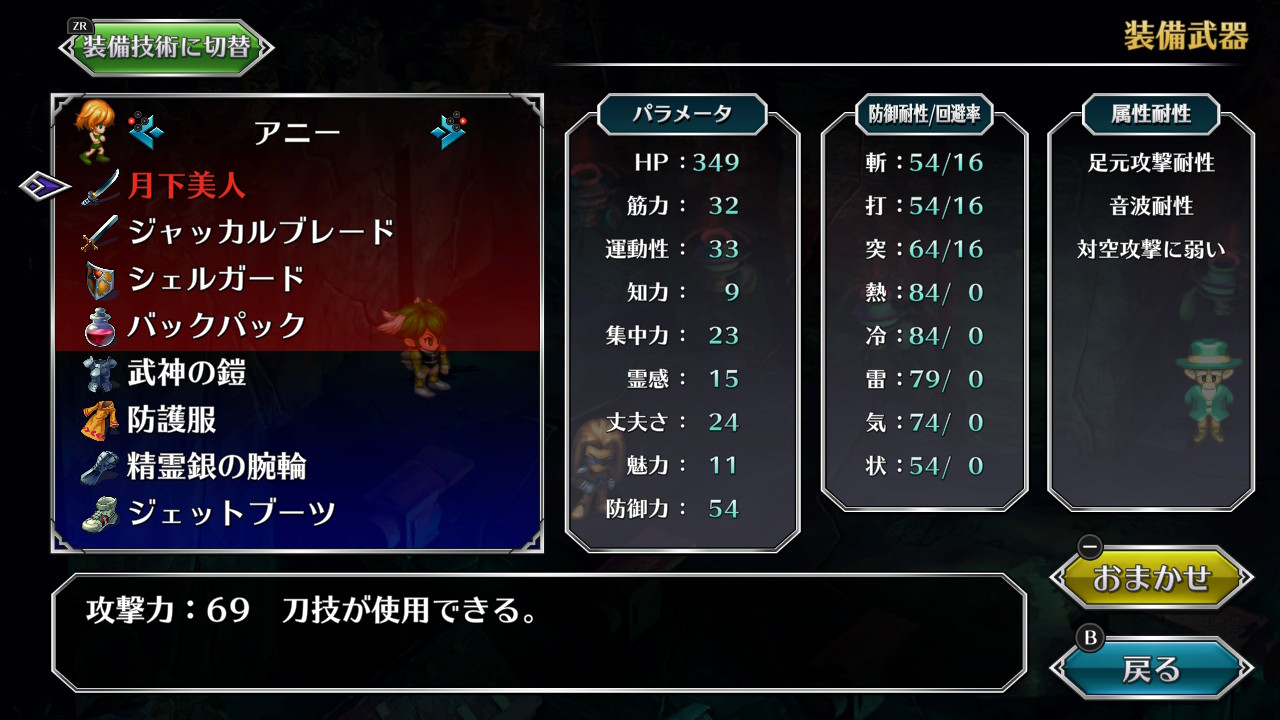 アニー日記 クーン編1 サガシリーズ 2021年04月15日 というわけで本格的にプレイし始めました。まずはクーン編から。 アニー以外は全員モンスターというゆるい縛りです。ただしゆるいのはメンツが揃ってから。タンザーまではクーン一人なので普通にやってると激キツです。なのでそこまでは多少計画的にプレイ。まずはバトルマニアの姉妹を相手に4種の能力を吸収。あんまり利点はないけどまあ通過儀礼みたいなもんです。フェイントはここだけだっけな。ほんでスクラップ編。ここではヴァルカン+鋼の傭兵団3体が相手。まずは逃走可能になったのをいいことに敵シンボルを消しまくり、クレーンをすべて作動させて援護射撃を徹底的に潰す。PS版の鬱憤を晴らすかのように。ほんと避けにくかったからなここは……。もちろんラモックスのままでは勝ち目は薄い。能力吸収のため1戦だけは真面目に戦う。相手はもちろん?スパルトイ。目的の能力は中盤までの大黒柱とも言える『グランドヒット』。威力が高く、連携もしやすく、鳥系ランク5のアクスビークに非常になりやすい能力。しばらくこれ一本でいけます。アクスビークが見劣りするようになってきたらちょっと邪魔くさくなるが。めちゃくちゃにハマってリセットを繰り返すがなんとか吸収。そのまま能力値と技のパワーに物を言わせてボス撃破。狙ってもないのにバンパー入手。お次はタンザーだが、ここが鬼門。ボスのタンザーは序盤にしてはHPがかなり高く、お供(ターゲットに取れないタイプ)との連携攻撃を放ってくる強敵。タンザーの攻撃は高確率で『強酸』なので水耐性を付けておきたい。それでも連携の『胞子酸』だと貫通されて一撃死するが。変身して水耐性をつけることもできるとは思うが、ボディごとの耐性なんて把握してないし調べるのも面倒なので、クーロンの下水道で戦ってランク2にし、ガンフィッシュから『パールハート』のドロップを狙うことにする。準レア枠とレア枠の両方がパールハートなので確率はそう低くない。すんなり来てくれた。素早くなりたかったのでラバットから超音波を吸収しソニックバットに変身。でも今にして思うと遅いほうがタンザーの連携に割り込む可能性が出来てよかったかも……。こうもりは筋力も低めだし。 道中のボス戦、カモフックからブーメランフックを吸収。これも通過儀礼のようなもんだけど、連携しやすいので実用性も結構あったり。タンザー戦では『胞子酸』が来ないようにひたすら祈りつつ、グランドヒットを4発入れてなんとか勝利(3発だとギリギリ足りない)。やっぱアクスビークのままがよかったかも。タンザークリア後は自由行動。念願のモンスター仲間が加入する上、しばらくは大したボス戦もなくヌルい区間が続く。ヨークランドはちょっとアニーの台詞があるのでとっておく。サンダーとコットンを加入させたらまずはシュライク・済王の古墳へ。クーン編では済王はボス戦なしで仲間になるので非常に楽。上手い人はわざとここのクリアを遅らせ、メカに勾玉をズーッと持たせておいてマグマスライム戦あたりまで活用したりするらしいが俺には関係ない。不死系の固定敵を適当に蹴散らして神器を手に入れ、済王をお迎え。次はオウミ。タンザーを単独で倒したのに4対1でイカに負ける道理がない。パールハート(オウミ地下で2個めが手に入る)を装備したクーンと済王の『グランド草薙の剣』で2ターンキル。余談ですが、サガシリーズの敵キャラの中でデビルテンタクラーが一番好き。あの憎たらしい顔がいいよね。その次はバカラへ。ここは場合によってはボス戦もあるんだけど、それにはネズミを奥の奥へ追い込む必要がある。戦う気だったんだけどなかなかうまく行ってくれずにガチャガチャやってたら捕まえちゃった。すまん巨獣。さあ、バカラを含む3箇所をクリアしたことでいよいよディスペアへの道が開かれる。主役であるアニーの登場だ。とはいえディスペア自体も移動だけでボス戦はない。さっさとクリアして脱出。ここからはアニーを中心にパーティを鍛え上げることにする。フルドの工房でエティンと戦い、アニーの能力値を上げつつモンスターの能力埋め。仕様変更により、能力枠を8個きっちり埋めないといらない能力を消せないようになってしまったようだ。弱い変身に繋がりやすかったり死の属性のようにデメリットがあったりと即座に消したい能力も多いので、ここは少し不便。エティンの能力だけでは埋まらないのでバンシーにも何度か相手してもらって、ついでに精霊銀の腕輪をかっぱらう。ある程度強くなったら武王の古墳へ。そう、ミミック狩りである。目的は言わずもがな、奴がドロップする月下美人。閃き的にアニーとの相性は良くない武器だが、今回はとある戦闘でどうしても剣技を必要とするだろうから取っておく。とはいえ半端な強さでは狩られるのはこっちの方。先のエティン・バンシー狩りである程度戦力を調えておい
