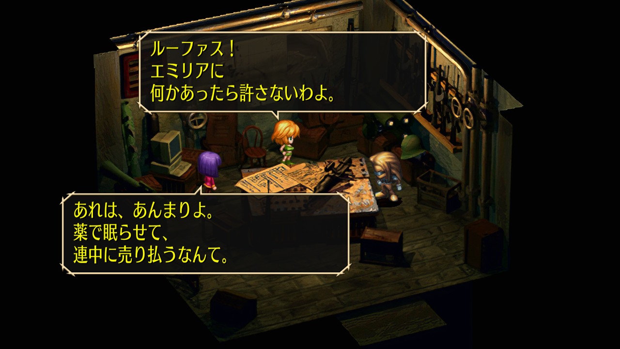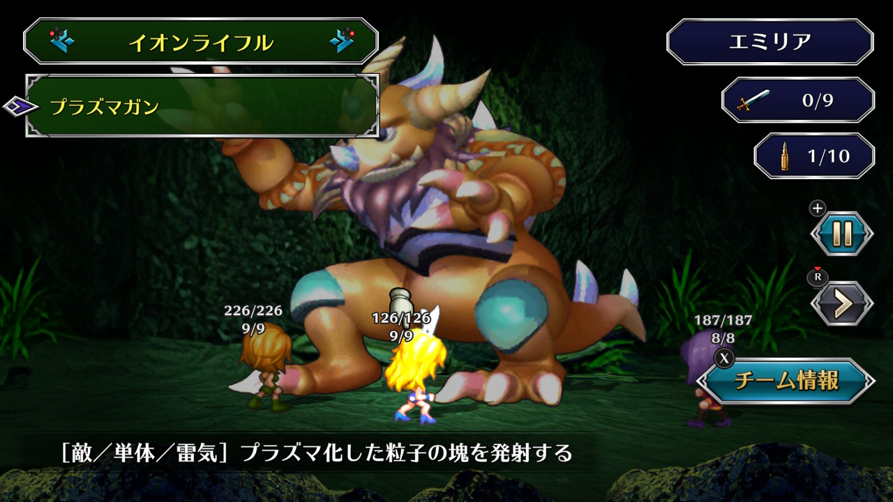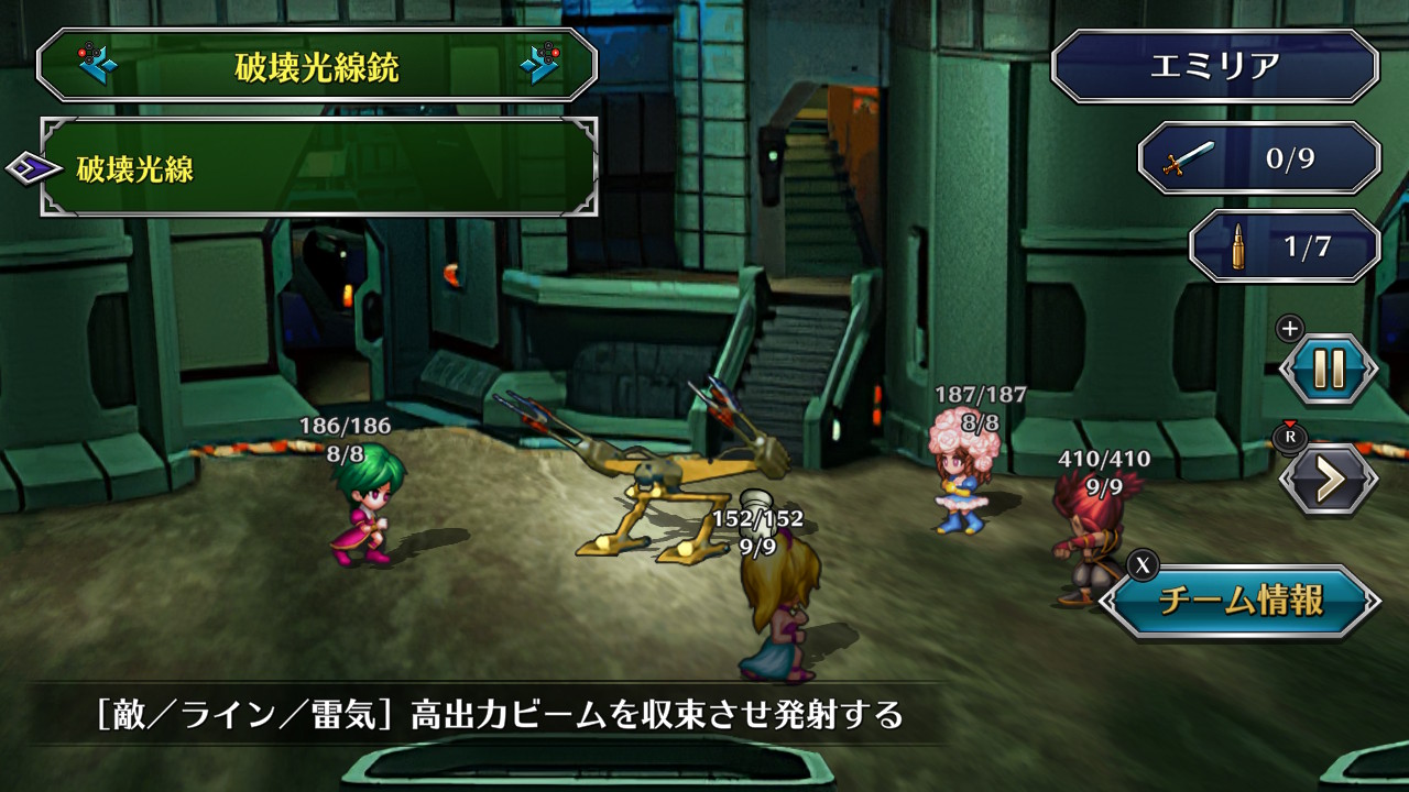 アニー日記 エミリア編2 サガシリーズ 2021年05月05日 はい、エミリア編の続き。今回は予告通り世界巡りからスタートです。 とはいってもお宝を拾うだけでほとんど戦闘は必要ない。道を塞いでいるのはオウミのデビルテンタクラー、シンロウ遺跡の固定敵くらいかな。逃走があるので敵避けの難所とかも関係なく、ずんずん拾っていけます。特に美味しいのはシンロウの古代のシップ。ここで手に入る強化装甲とデュエルガンをスクラップで売却すれば合計5500クレジットになる他、金袋もちょくちょく落ちている。また売れはしないが電束放射器は強力な重火器。ありがたく使わせてもらおう。シュライク・済王の古墳ではナイトスケルトン2体がお宝を守っている。普段は互いをディフレクトで守り合う嫌な相手だが重火器なら相性はいい。敵の連携にだけ注意(何をするわけでもないが)しつつ、プラズマガンをぶち込んでいく。天叢雲剣は何の役にも立たないが、水鏡の盾は非常に優秀。物理・熱属性の回避に加えて水耐性も備える。鎮魂の勾玉も固有能力の聖歌が非常に強いが今回は使用は禁止。とはいえ単なる防具としてもそこそこ優秀。水耐性を得たのでイカ撃破に挑戦。ルーファスにバックパック、HPの低いエミリアに水鏡を持たせ、他の連中は冷・気防をなるべく高めて初ターンは防御。それでもライザが落ちてしまったが傷薬で回復しながらプラズマガンを中心に攻めていく。2度目のメイルシュトロームが来なければあとは楽勝だ。ここらでクーロンに戻り、破壊光線銃と粒子加速砲を購入。最後まで使える武器たちだ。火力が高まったところでシンロウ遺跡に潜り、ヴァルキリーから精霊銀の腕輪を強奪。落ちている分と合わせて精霊銀装備が3つ手に入る。最奥でエクセルガードも入手してウハウハ。装備が一気に充実したところでグラディウスの任務を進めていく。まずはシンロウの仮面武闘会だが、これはボスがめちゃくちゃ雑魚なのでどうでもいい。イベント前の余興として負けてもいいバトルがあり、こっちはそこそこ強いやつが出てくる。普段はここで技の閃きを狙うのも一興だが今回はそれもないのでソッコーで負ける。4人全員が強めの重火器を持っているのでゴブリン戦は楽勝。というかここで苦戦するほうが難しい。バカラではボスと戦わないという選択肢もある。実はここでエンディングの分岐がなされており、ボスと戦わないことでハッピーエンドフラグが立つのだが、ノーマルエンドの方が断然好きなので今回は戦うことに。あと単純に戦いたいしね。巨獣は見た目通り、物理攻撃を得意とするパワータイプ。こちらは物理防御を上げ、全員に盾とジェットブーツを装備。ジェットブーツがあれば使用頻度の高い尾撃と非常に痛い地震を封殺できるのでかなり有利になる。これらを除けば単体攻撃ばかりなので、3人いれば崩されることはそうない。攻撃力は高いがHPはそう高くないので、プラズマプラズマ光線を何度か叩き込めば勝てる。バカラを突破したらお次はラムダ基地。ここでアセルス、白薔薇、ゾズマが加入。上級妖魔はラストボスに対して有利に戦えるので、白薔薇とゾズマはラストメンバー候補筆頭。アセルスは今回のプレイでは妖魔化できない。ここからはエミリアに破壊光線銃を持たせる。破壊光線は威力こそ高いが連携は不得意で、特に後ろにはほとんど繋がらない。プラズマガン→破壊光線は幸い繋がるので、最終的にはプラズマ~プラズマ光線が主軸になるだろう。ここで大事になるのが行動順。前回にちょっと言ったが、今回のプレイでQUIが上がることはないので、初期値の低いエミリアは基本ずっと最遅になる。というわけで最後尾の破壊光線係はエミリアに一任することに。この時点での破壊光線の威力はなかなかのもので、キャンキャン、リビングアーマーともにそこまで苦戦はしなかった。ただ、回復がアイテムのみというのがこのあたりから効いてくる。バックパックは1個しかなく、それ以外のアイテムは1個につき武器欄1個を占領する。敵のHPが増えれば必要な弾数も増えてくるため、今後はどこまで重火器を装備しどこまでをアイテムに割くかのせめぎあいになってくる。精神耐性を持つ白薔薇とゾズマが加入したのでちょっとミミックと対決。エミリアにパープルアイを装備させたので、最も怖い魅了凝視を3人が無効化できる。じゃあゾズマを前列に置けばいいのにね……あ、見切りを狙ってたのか。ミミックは強敵だが連携さえ決められれば2ターン程度で撃破できる。粘って精霊銀の腕輪を無事入手。ラムダ基地2回目は短縮ルートで。こちらでは1回目同様、2ランク上のメカ系との戦闘になる。というわけで今度は単独でキャンキャンとの戦闘。破壊光線2発で撃破はできるのだが、お供が出てきて連携を食らってしまい1敗。ここに関してはエミリアの剣技やら銃技を頑張って鍛えるよりも破壊光線の方が楽かも。イベント後、グラディウスの仲間が迎